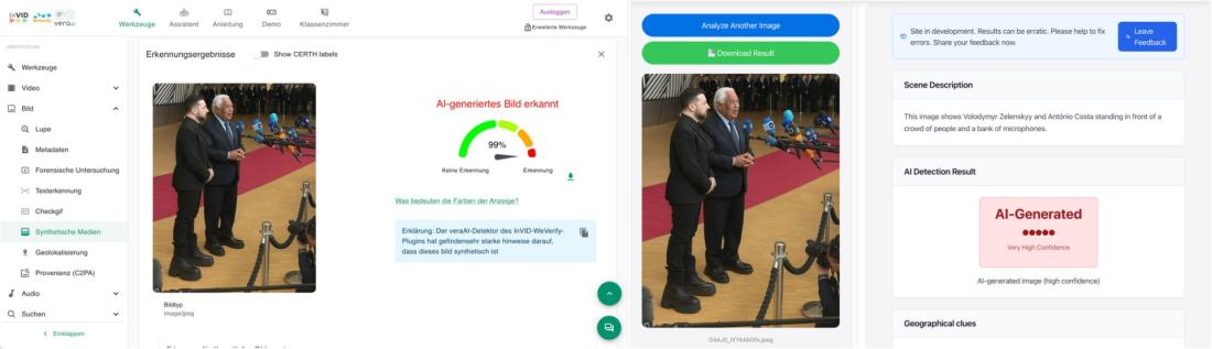 AFP untersuchte das Bild einerseits mithilfe des Verifizierungstools InVid-WeVerify, andererseits mit dem frei zugänglichen Tool ImageWhisperer, das Verifikationsexperte Henk van Ess erstellte und derzeit weiterentwickelt. Beide Analysen ergaben mit sehr hoher Erkennungsrate, dass das Bild mittels KI erzeugt wurde.