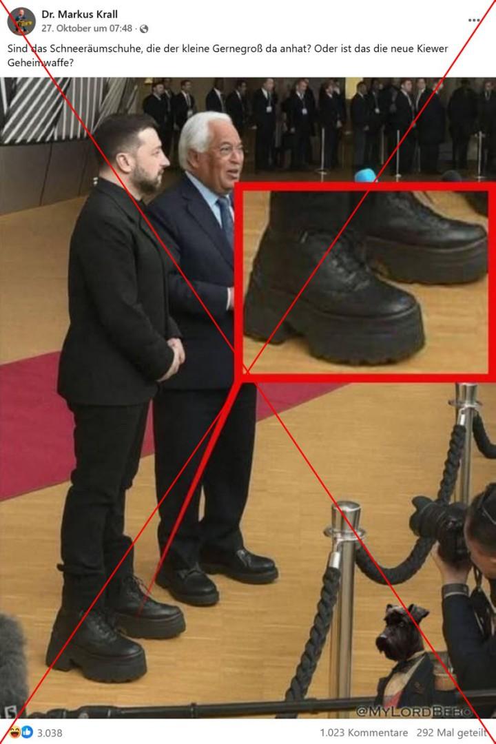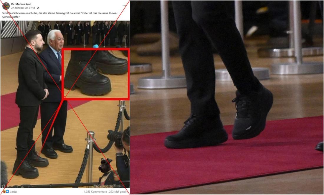 Der ukrainische Präsident Wolodymyr Selenskyj posiert in einem Bild, das hundertfach auf sozialen Plattformen wie Facebook und X am 27. Oktober 2025 geteilt wurde. Neben ihm steht der Präsident des Europäischen Rates António Costa. Ein rot umrandeter Ausschnitt im Bild zeigt Selenskyjs Schuhwerk aus der Nähe: Es soll sich um schwarze Stiefel mit Schnürsenkeln und hohen Plateausohlen handeln.