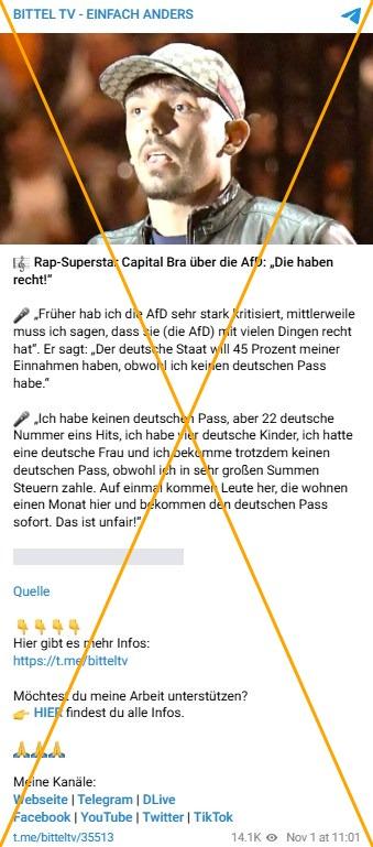 "Auf einmal kommen Leute her, die wohnen einen Monat hier, die kriegen einen deutschen Pass, sofort", sagte Capital Bra in einem Interview mit dem Influencer Vegeraldt Belkason, das Ende Oktober 2025 live auf Tiktok gestreamt wurde und noch auf Youtube abrufbar ist (hier archiviert). Die Aussage des Rappers wurde auch auf Facebook, X und Telegram von Nutzerinnen und Nutzern sowie von einem AfD-Stadtverband verbreitet.