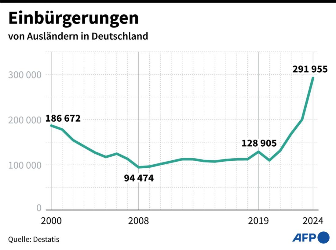 2024 wurden laut dem Mediendienst Integration fast 292.000 Personen eingebürgert – 46 Prozent mehr als im Vorjahr. Die meisten von ihnen stammen aus Syrien. Dieser Anstieg ist vermutlich unter anderem auf die Reform des Staatsbürgerschaftsrechts im Jahr 2024 zurückzuführen.