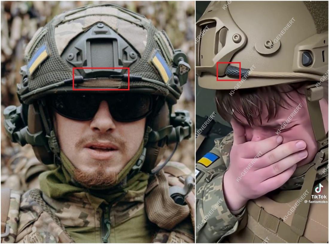 Die bereits angemerkte Schraube auf dem KI-generierten Bild wirkt im Vergleich mit dem authentischen ballistischen Helm fehl am Platz. Zudem fehlen die schwarzen Haken auf dem Seitenriemen, die in der Originalversion auf dem Helm befestigt sind.