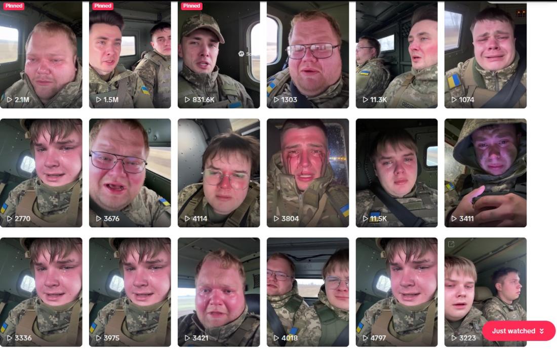 Eine umgekehrte Bildsuche mithilfe von Screenshots aus dem Clip führte zum Tiktok-Account "@fantomoko", dessen Name auch im geteilten Clip zu sehen ist. Der Account veröffentlichte mehrere Videos von angeblich weinenden Soldaten mit ukrainischem Emblem auf dem Jackenärmel. Manche waren mit dem Wasserzeichen Sora versehen, welches deren Erstellung mithilfe einer App des US-amerikanischen Softwareunternehmens OpenAI kennzeichnet. Andere Videos trugen offensichtliche Merkmale einer Bildmanipulation und zeigten etwa einen Soldaten, dessen Tränen wie Bluttropfen schienen, wie im vierten Video von links in der zweiten Reihe zu sehen ist: