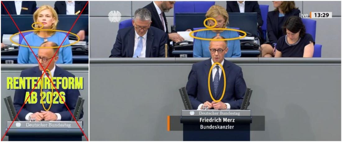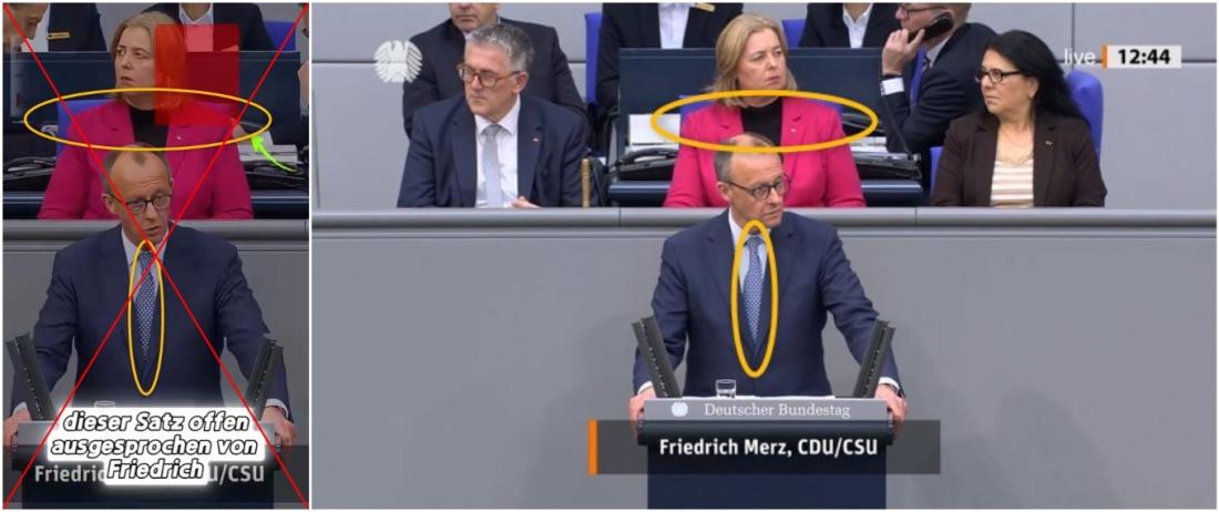 Im Video mit Bas im Hintergrund ist eine Rede während der Debatte vom 13. März 2025 zur Aussetzung der Schuldenbremse zugunsten von Investitionen in die Verteidigungsfähigkeit Deutschlands zu sehen, wofür das Grundgesetz geändert werden musste. Auch hier stimmen Merz' Krawatte sowie das Kostüm und das Oberteil der damaligen Bundestagspräsidentin Bas mit der Kleidung im online geteilten Video überein.