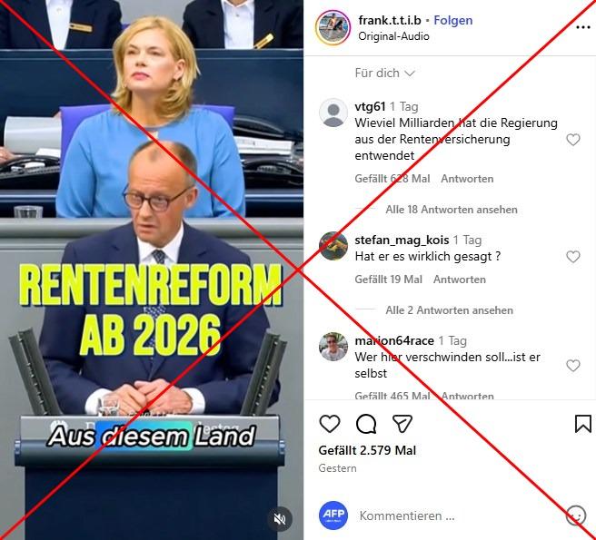 "Die Rentner sollten aus diesem Land verschwinden", sagt Bundeskanzler Friedrich Merz (CDU) angeblich in einer Aufnahme, die am 17. November 2025 auf Instagram gepostet wurde. Während dieses Satzes ist Merz am Rednerpult des Deutschen Bundestags zu sehen.
