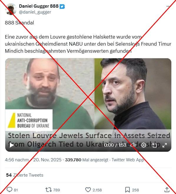 "Eine zuvor aus dem Louvre gestohlene Halskette wurde vom ukrainischen Geheimdienst NABU unter den bei Selenskyjs Freund Timur Mindich beschlagnahmten Vermögenswerten gefunden", heißt es in einem X-Beitrag vom 20. November 2025. Auch auf Facebook und weiteren Sprachen wie Englisch, Französisch, Slowakisch oder Tschechisch kursierte die Behauptung.