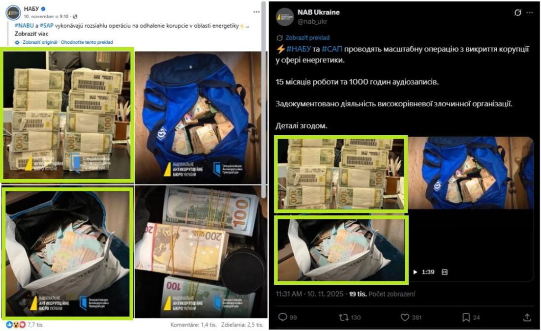In den Beiträgen auf Deutsch wird ein englischsprachiges Video geteilt. Es beginnt mit der Einblendung der Logos des Nationalen Antikorruptionsbüros der Ukraine (Nabu) und der Sonderstaatsanwaltschaft für Korruptionsbekämpfung (Sapo), wodurch der Eindruck entsteht, es handele sich um offizielles Material. "Ein Korruptionsskandal auf höchster Ebene der ukrainischen Regierung hat eine unerwartete Wendung genommen. Unter den beschlagnahmten Vermögenswerten von Timur Minditsch haben die Ermittlerinnen und Ermittler einen Teil der aus dem Louvre gestohlenen Juwelen entdeckt", sagt eine männliche Stimme auf Englisch.