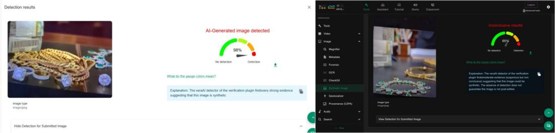 AFP analysierte die verdächtigen Bilder mit dem neuesten Modell des synthetischen Bilddetektors von InVID WeVerify, den AFP mitentwickelt. Bei dem Bild mit verschiedenen Halsketten stellte es mit 98-prozentiger Sicherheit fest, dass das Bild durch Künstliche Intelligenz (KI) erstellt worden war. Für das Bild der Smaragdkette lag die Bewertung bei 65 Prozent.