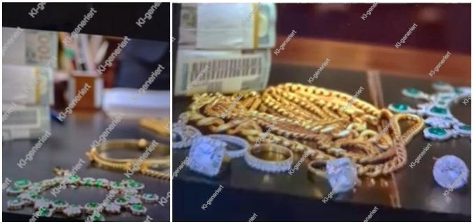 Neben dem Stapel aus Banknoten sind auf beiden Bildern Schmuckstücke zu sehen, darunter eine Halskette mit grünen Edelsteinen.