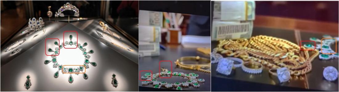 Darauf sind die echten Edelsteine länglicher als in den Beiträgen mit der Falschbehauptung. Außerdem befinden sie sich nicht an identischen Stellen der Halskette. Im manipulierten Bild (Mitte) enthält einer der grünen Edelsteine zudem ein Goldelement, das kein Bestandteil der echten Kette ist.