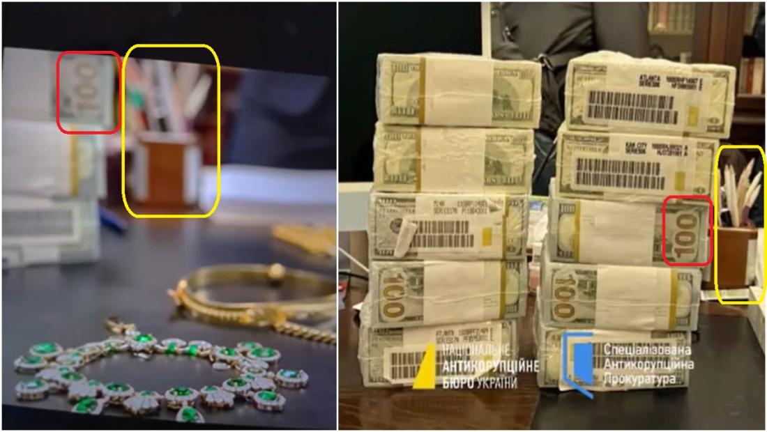 Bei genauerer Betrachtung des linken Bildes fällt auf, dass versucht wurde, das Aussehen des Stapels auf den Banknoten und des Behälters mit Stiften aus dem authentischen Foto nachzuahmen. Die Zahlen auf dem 100-Dollar-Schein stimmen jedoch nicht mit jenen auf den echten Dollar-Banknoten im rechten Bild überein.