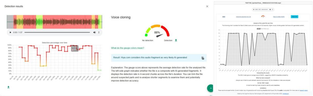 Darüber hinaus bestätigte die Analyse der ältesten Version des Videos, die AFP finden konnte, in dem englischsprachigen Post mit dem Tool deepfake-total.com des Fraunhofer-Instituts mit einer Wahrscheinlichkeit von 68 Prozent, dass es sich bei der Tonspur um einen Deepfake handelt. Die neueste Entwicklerversion des Audiotools Hiya von InVID WeVerify ergab eine Wahrscheinlichkeit von 88 Prozent, dass die Tonspur in dem fraglichen Video mit KI erstellt wurde.