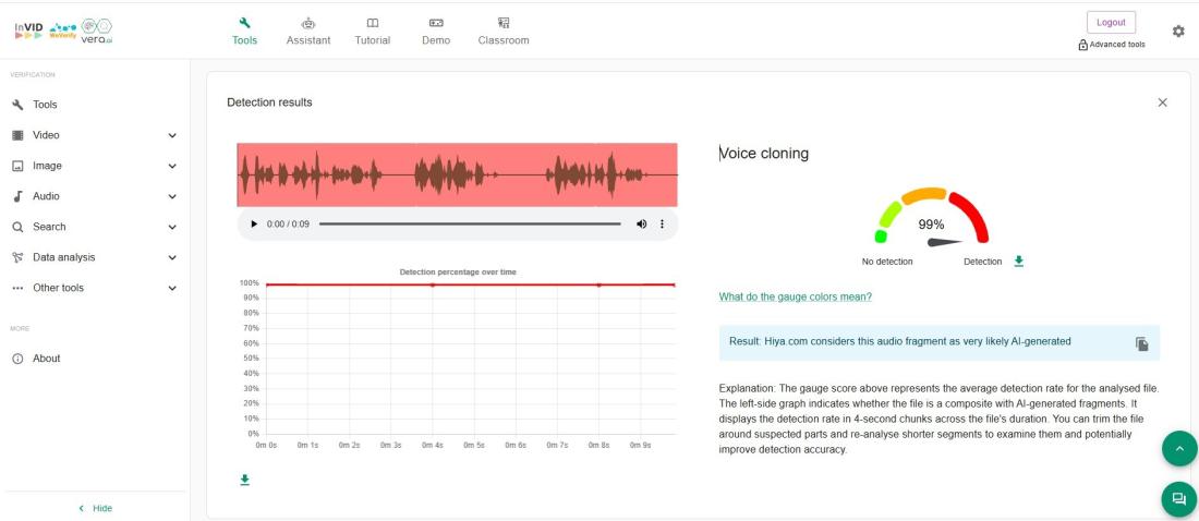 Zudem hat AFP die Tonspur des Videos mit dem KI-Erkennungstool Hiya des Analyseprogramms InVID WeVerify überprüft, an dessen Entwicklung AFP beteiligt ist. Das Ergebnis zeigt, dass die Audiospur mit einer Wahrscheinlichkeit von 99 Prozent KI-generiert ist.