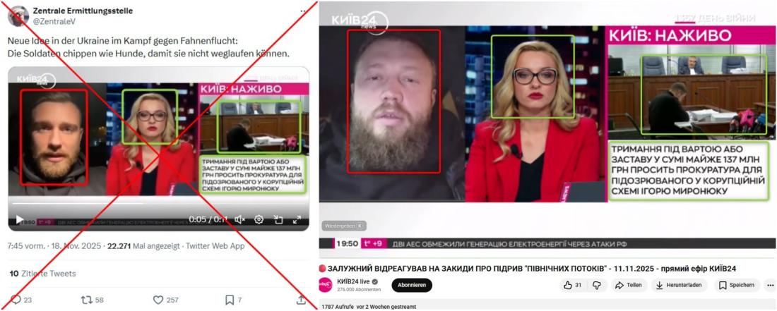 Der Sender Kyiv24 bestätigte gegenüber AFP, dass er ein solches Interview nie ausgestrahlt habe. Das Video, in dem ein Soldat vorschlägt, Streitkräften Mikrochips zu implantieren, sei "komplett gefälscht", schrieb Natalia Lyaschtschenko, ausführende Produzentin bei Kyiv24, in einer E-Mail vom 20. November 2025.