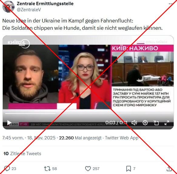 "Neue Idee in der Ukraine im Kampf gegen Fahnenflucht: Die Soldaten chippen wie Hunde, damit sie nicht weglaufen können", heißt es in einem X-Beitrag vom 18. November 2025. Der Beitrag enthält zusätzlich ein elf Sekunden langes Video.