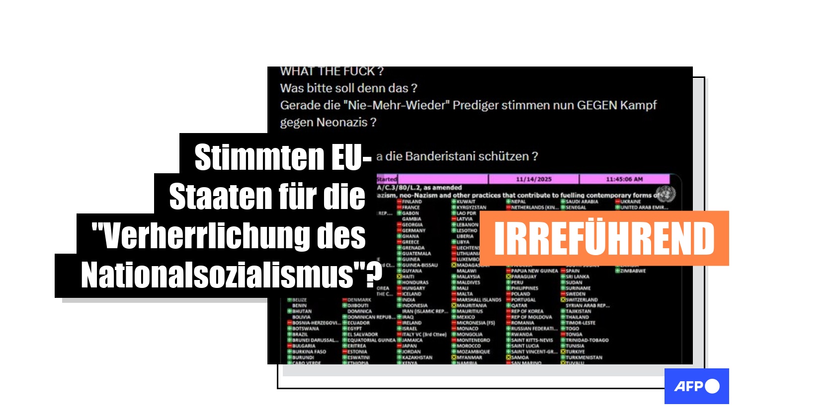 "Gerade die 'Nie-Mehr-Wieder' Prediger stimmen nun GEGEN Kampf gegen Neonazis", lautet ein Facebook-Beitrag vom 17. November 2025. Dazu ist ein Bild mit Abstimmungsergebnissen eines Votums der Vereinten Nationen (UN) angehängt. "Österreich und alle anderen Staaten der Europäischen Union stimmen GEGEN eine UN Resolution, die die Glorifizierung des Nationalsozialismus verurteilt und deren Bekämpfung fordert", so die angebliche Eilmeldung, die 175 Mal geteilt wurde. Ein Kommentar lautet: "Österreich mit seinem Widerbetätigungsgesetz (Verbotsgesetz 1947) stimmt da zu!" Auf X wurde die Behauptung ebenfalls geteilt.