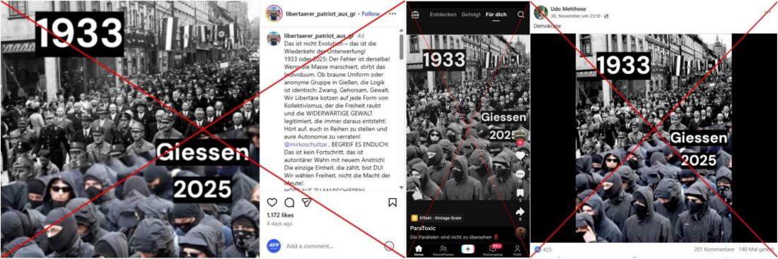 "1933 oder 2025: Der Fehler ist derselbe!", lautet eine Instagram-Beschreibung am 1. Dezember 2025. "Ob braune Uniform oder anonyme Gruppe in Gießen, die Logik ist identisch: Zwang, Gehorsam, Gewalt." Dazu wird ein Bild geteilt, das aus zwei zusammengeschnittenen Fotos besteht. Die obere Hälfte zeigt ein schwarz-weißes Foto, das laut Überschrift von 1933 stammen soll und zeigt, wie uniformierte Männer eine mit NS-Fahnen behängte Straße entlang marschieren. Die untere Hälfte besteht aus einem farbigen Foto, das angeblich von 2025 stammt und eine schwarzgekleidete, vermummte Menschenmenge zeigt. Laut Überschrift sei Gießen Schauplatz beider Ereignisse gewesen. In der hessischen Stadt fanden Proteste gegen die Gründung der Jugendorganisation Generation Deutschland der Partei Alternative für Deutschland (AfD) am 29. November 2025 statt.