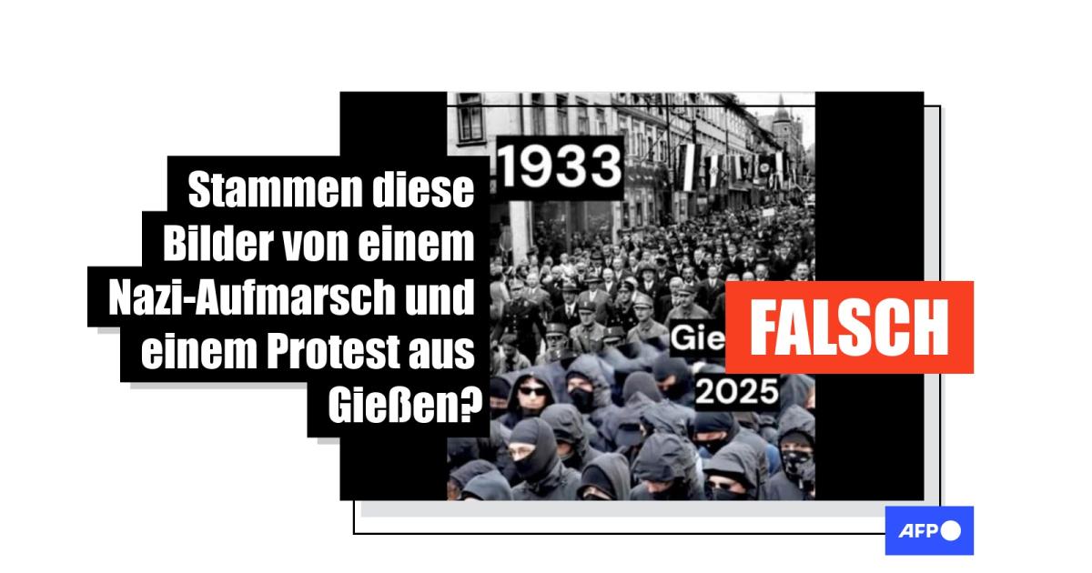 Die Gründung einer neuen Jugendorganisation der Alternative für Deutschland in Gießen Ende November 2025 wurde von massiven Protesten begleitet. In sozialen Medien kursierten daraufhin Fotos, die einen Vergleich der Protestierenden mit Nationalsozialisten aufstellen: Angebliche Fotos von der Demo in Gießen wurden mit einer historischen Aufnahme von einem Nazi-Aufmarsch am vermeintlich selben Ort gegenübergestellt. Doch AFP-Recherchen zeigen, dass die Fotos nicht aus Gießen stammen und nichts mit den Protesten – die laut Innenministerium in großen Teilen friedlich verliefen – zu tun haben.