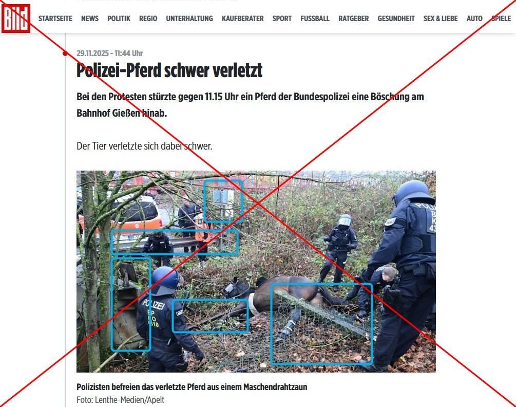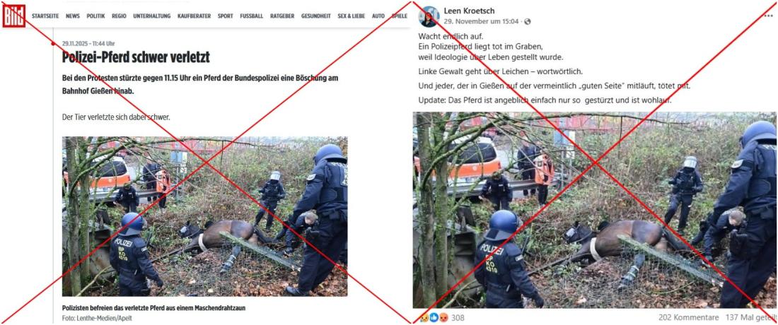 "Polizei-Pferd schwer verletzt", schrieb die Tageszeitung "Bild" am 29. November 2025 um 11.44 Uhr im Liveticker zum Gründungskongress der Jugendorganisation der Alternative für Deutschland (AfD) in Gießen und den Gegenprotesten, die den Kongress begleiteten. "Bei den Protesten stürzte gegen 11.15 Uhr ein Pferd der Bundespolizei eine Böschung am Bahnhof Gießen hinab." Dazu veröffentlichte die Boulevardzeitung ein Bild des am Boden liegenden Polizeipferdes, ein Huf ist in einem umgeknickten Maschendrahtzaun verheddert.