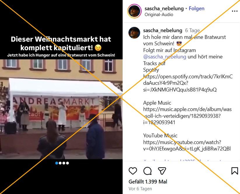 Ein Video zeigt einen Mann, der in einem weißen Gewand gekleidet ein scheinbar islamisches Lied oder Gebet singt. Eine Stimme kommentiert den Gesang mit "sehr weihnachtlich", bevor die Kamera geschwenkt wird und ein Weihnachtsbaum zu sehen ist. "Dieser Weihnachtsmarkt hat komplett kapituliert!", schrieb ein Nutzer am 5. Dezember 2025 dazu auf Instagram. Das Video wurde auch auf Facebook geteilt und kursierte auf anderen Sprachen wie Englisch, Griechisch, Russisch und Slowakisch.