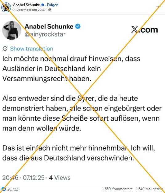 "Ich möchte nochmal drauf hinweisen, dass Ausländer in Deutschland kein Versammlungsrecht haben", schrieb Anabel Schunke am 7. Dezember 2025 auf X. "Also entweder sind die Syrer, die da heute demonstriert haben, alle schon eingebürgert oder man könnte diese Scheiße sofort auflösen, wenn man denn wollen würde", fügte die neurechte Influencerin hinzu. Sie teilte einen Screenshot ihrer Aussage auch auf Facebook, der über 1700 Mal verbreitet wurde. AFP hat bereits zahlreiche Falschbehauptungen von Schunke überprüft.