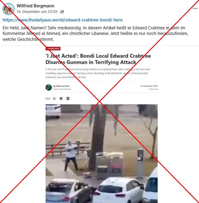 Fazit: Nach dem Anschlag am Bondi Beach in Sydney in Australien am 14. Dezember 2025 kursierten online zahlreiche Falschinformationen über einen angeblichen Angreifer, die angebliche Identität des Mannes, der einen der Angreifer entwaffnete, sowie über angebliche Feiern aufgrund des Anschlags. AFP widerlegte diese Falschbehauptungen jedoch.