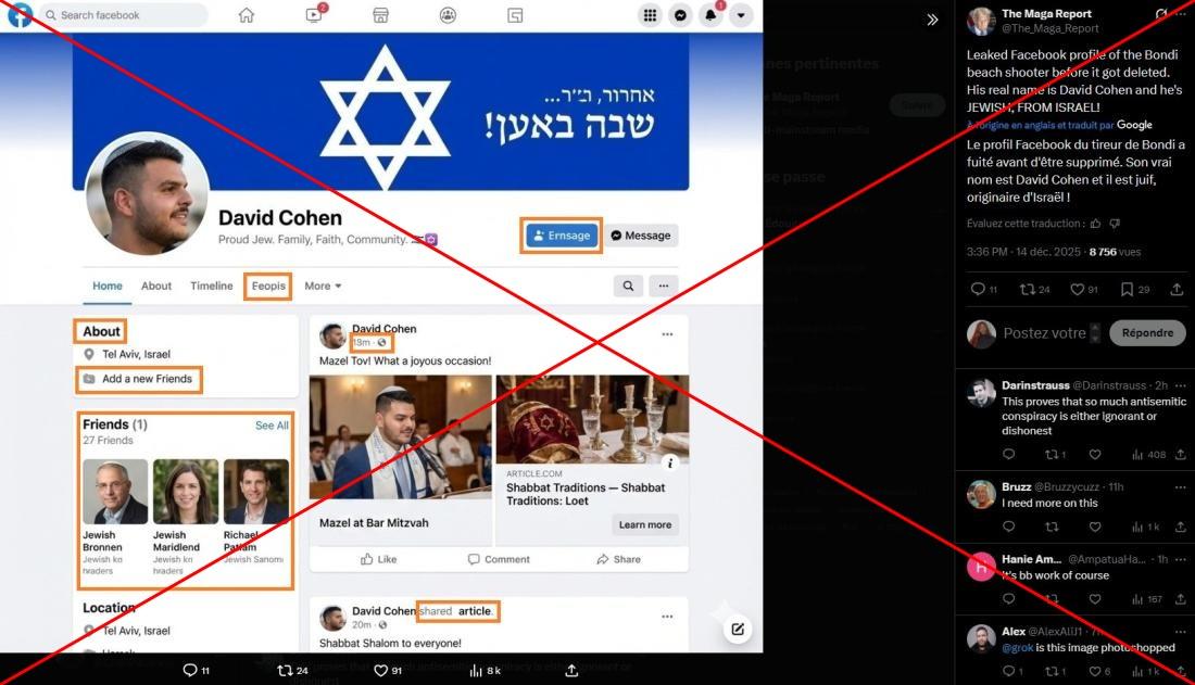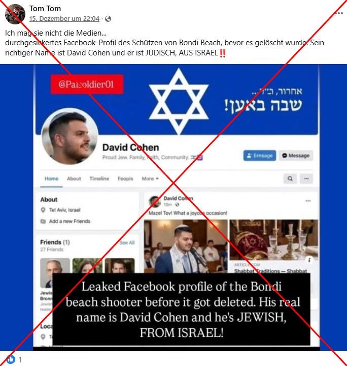 Ein Screenshot zeige ein "durchgesickertes Facebook-Profil des Schützen von Bondi Beach, bevor es gelöscht wurde. Sein richtiger Name ist David Cohen und er ist JÜDISCH, AUS ISRAEL", schrieb ein Nutzer am 15. Dezember 2025 auf Facebook. Ähnliche Behauptungen wurden auch auf X sowie auf anderen Sprachen wie Englisch, Französisch und Türkisch verbreitet.