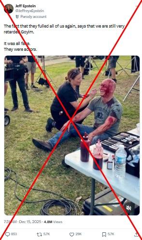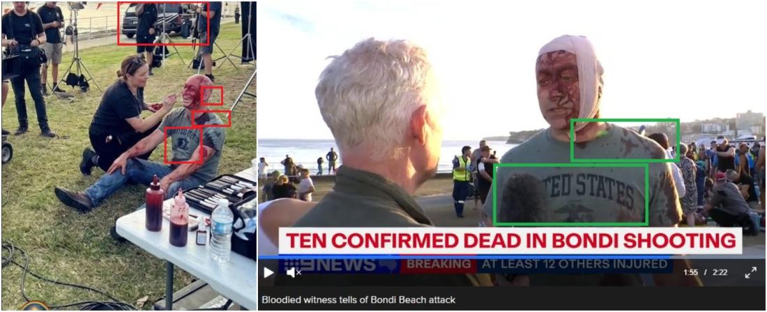 Auf einem der Bilder soll einer der Verletzten des Anschlags von Bondi Beach zu sehen sein, Arsen Ostrovsky (archiviert). Er ist ein auf Menschenrechte spezialisierter Anwalt, der den Vorsitz des Australian/Israeli & Jewish Affairs Council in Sydney (AIJAC) innehat. Auf dem Bild lächelt er und wird mit Kunstblut geschminkt, scheinbar um die Rolle eines Opfers zu spielen.
