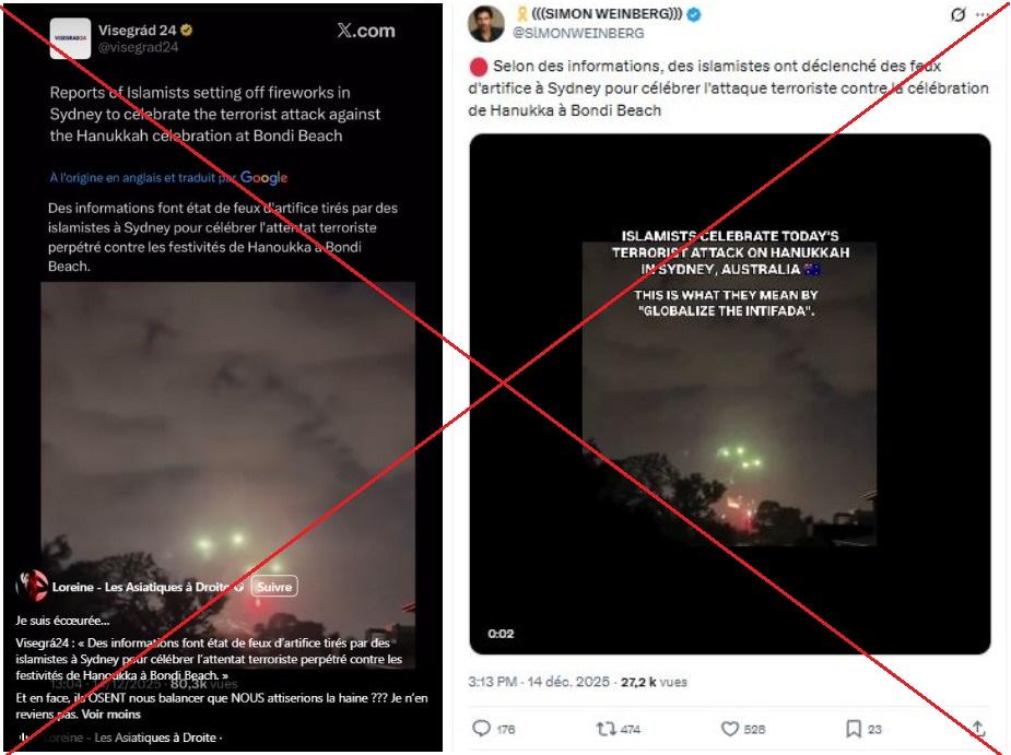 Am Abend nach dem Anschlag teilten Internetnutzerinnen und -nutzer beispielsweise auf X ein Video eines Feuerwerks in einem Vorort von Sydney und behaupteten, dieses würde zeigen, wie "Muslime" den tödlichen Angriff feiern würden. Auch auf Englisch und Französisch wurde das Video verbreitet.