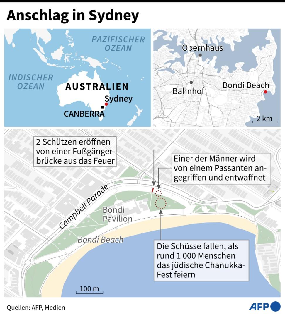 Am 14. Dezember 2025 verübten ein Vater und sein Sohn einen Anschlag auf ein jüdisches Chanukka-Fest am Bondi Beach in Sydney. Sie töteten 15 Menschen und verletzten 42 weitere. Der Anschlag wurde von den Behörden als "antisemitisch" und "terroristisch" bezeichnet und war der tödlichste Amoklauf in Australien seit Jahrzehnten. In diesem Zusammenhang kursierten in sozialen Medien zahlreiche falsche und irreführende Behauptungen, die AFP widerlegt hat.
