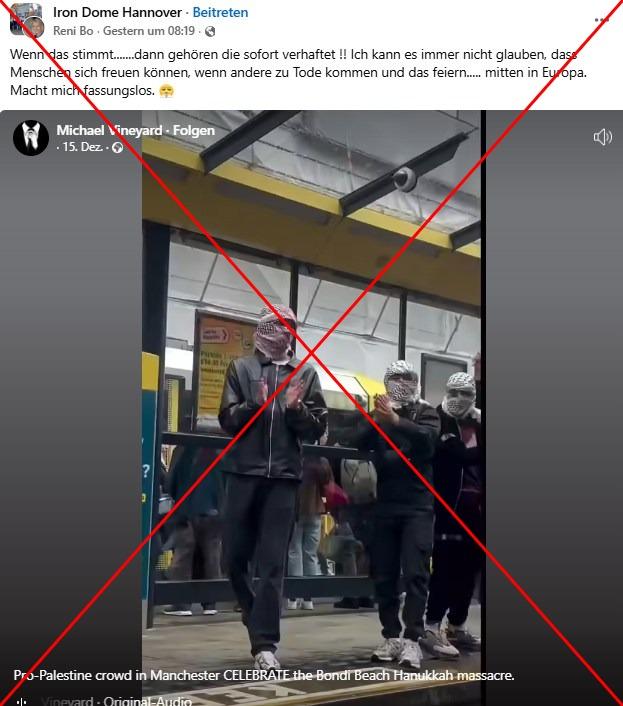 In ähnlicher Weise verbreiteten einige Nutzerinnen und Nutzer ein Video, von dem sie behaupteten, es würde eine "propalästinensische Menge in Manchester" zeigen, "die die antisemitischen Anschläge in Australien feiert". Darin sind Männer zu sehen, von denen einige Kufiyas tragen und während einer Demonstration singen und tanzen. Auf Facebook schrieb ein Nutzer am 17. Dezember 2025 dazu: "Ich kann es immer nicht glauben, dass Menschen sich freuen können, wenn andere zu Tode kommen und das feiern..... mitten in Europa. Macht mich fassungslos." Diese Behauptung wurde ebenfalls zunächst auf Englisch verbreitet und kursierte auch auf Französisch.