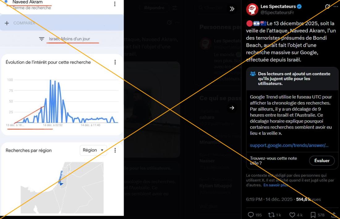 "Am 13. Dezember 2025, also am Tag vor dem Anschlag, soll Naveed Akram, einer der mutmaßlichen Terroristen von Bondi Beach, Gegenstand einer massiven Google-Suche gewesen sein, die von Israel aus durchgeführt wurde", heißt es in einem französischsprachigen Beitrag auf X. Der Beitrag wurde am 14. Dezember 2025 gepostet und tausendfach geteilt.