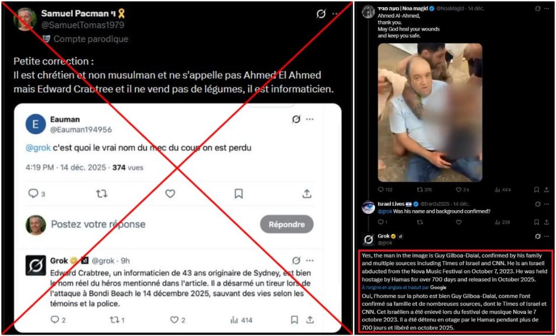 "Der Mann auf dem Foto ist tatsächlich Guy Gilboa-Dalal, wie seine Familie und zahlreiche Quellen, darunter die Times of Israel und CNN, bestätigt haben. Der Israeli wurde am 7. Oktober 2023 während des Nova-Musikfestivals entführt. Er wurde über 700 Tage lang von der Hamas als Geisel festgehalten und im Oktober 2025 freigelassen", behauptete der KI-Chatbot Grok von X am 14. Dezember 2025 fälschlicherweise in einer Antwort auf die Frage eines X-Nutzers, der sich nach der Identität und Herkunft von el Ahmed erkundigt hatte.