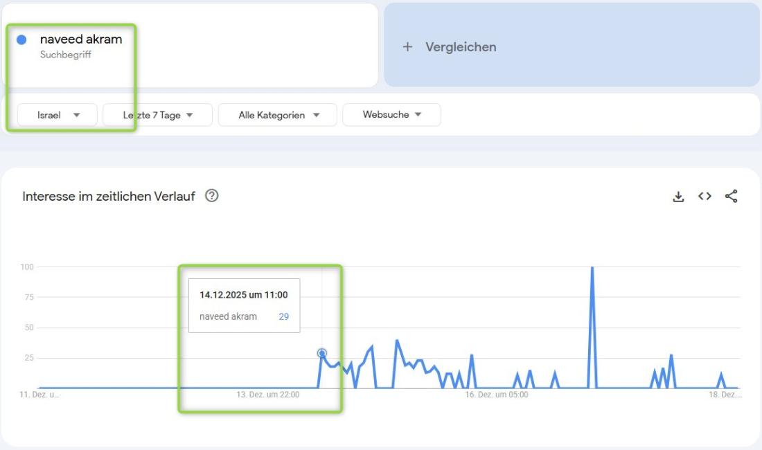 Den Daten von Google Trends zufolge erreichten die Suchanfragen im Zusammenhang mit dem Namen des mutmaßlichen Angreifers "Naveed Akram" einen ersten Höhepunkt gegen elf Uhr in Tel Aviv in Israel, also eineinhalb Stunden nach dem antisemitischen Anschlag und nicht am Tag zuvor.