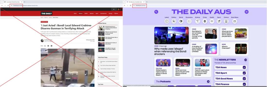 Eine Überprüfung der Website, deren einziger Artikel vermehrt von Social Media-Accounts außerhalb Australiens massiv online geteilt wurde, offenbart jedoch verdächtige Elemente: Die Website imitierte den Domainnamen der Website der australischen Zeitung "The Daily Aus", hat jedoch die Domain "thedailyaus.world" anstelle der authentischen Adresse "thedailyaus.com.au". Es handelt sich hierbei um eine häufig verwendete Technik, mit der die Identität eines echten Medienunternehmens missbraucht wird, um einer Falschmeldung Glaubwürdigkeit zu verleihen – sei es zu Propagandazwecken wie im Falle russischer Desinformationskampagnen oder um Engagement zu fördern.