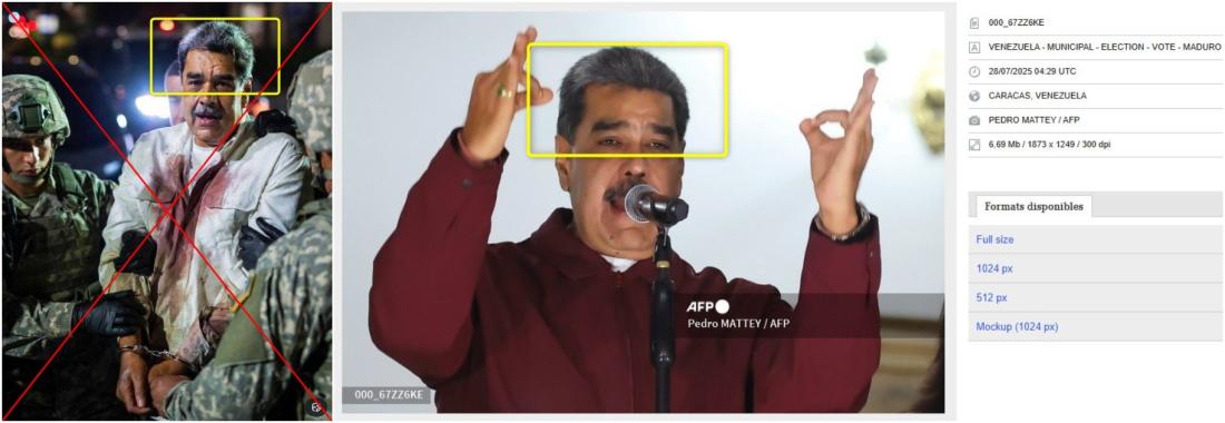 AFP hat nach der Gefangennahme mehrere irreführende Behauptungen über das Ereignis widerlegt, darunter ein weiteres mit Künstlicher Intelligenz (KI) erstelltes Bild, oder auch alte Videos, die zur Darstellung der Operation der US-Spezialeinheit verwendet wurden, sowie KI-generierte Aufnahmen von Feierlichkeiten zu Maduros Absetzung.