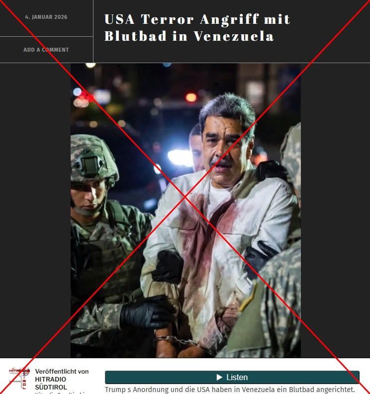 "USA angriff mit Blutbad in Venezuela", schrieb eine Facebook-Seite namens Radio Südtirol in einem Facebook-Beitrag vom 4. Januar 2026 und teilte darin einen Artikel der Website von Hitradio Südtirol, in dem ein Foto von Nicolás Maduro zu sehen ist. Auf dem Bild trägt der entmachtete venezolanische Staatschef Handschellen und ein weißes, blutverschmiertes Hemd.