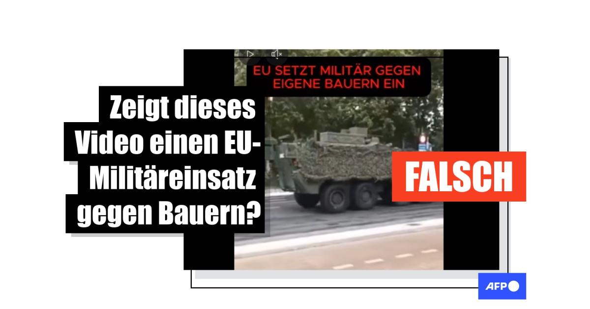 "EU setzt Militär gegen eigene Bauern ein", heißt es in einem Facebook-Video vom 21. Dezember 2025. "Nicht gegen Russland" würde die Europäische Union das Militär laut der Videobeschreibung einsetzen, "sondern gegen ihre eigenen Bauern – die Menschen, die 365 Tage im Jahr nonstop arbeiten, sich um die Landschaft kümmern und alle Lebensmittel anbauen". Im Video ist ein Militärkonvoi zu sehen, der durch eine Stadt fährt.