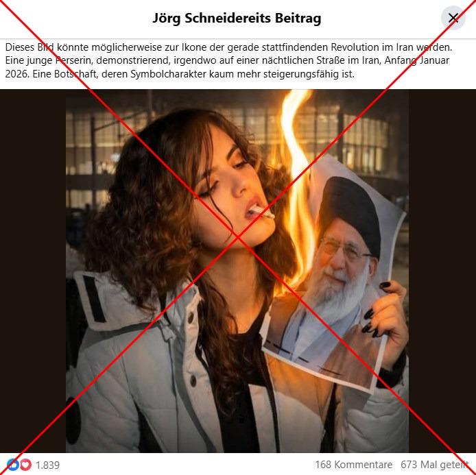 "Dieses Bild könnte möglicherweise zur Ikone der gerade stattfindenden Revolution im Iran werden", schrieb ein Facebook-Nutzer in einem Beitrag am 9. Januar 2026. Auf dem Bild ist eine Frau zu sehen, die sich an einem Foto von Irans geistlichem Oberhaupt Ayatollah Ali Chamenei eine Zigarette anzündet. "Eine junge Perserin, demonstrierend, irgendwo auf einer nächtlichen Straße im Iran, Anfang Januar 2026. Eine Botschaft, deren Symbolcharakter kaum mehr steigerungsfähig ist", schrieb der Nutzer weiter.