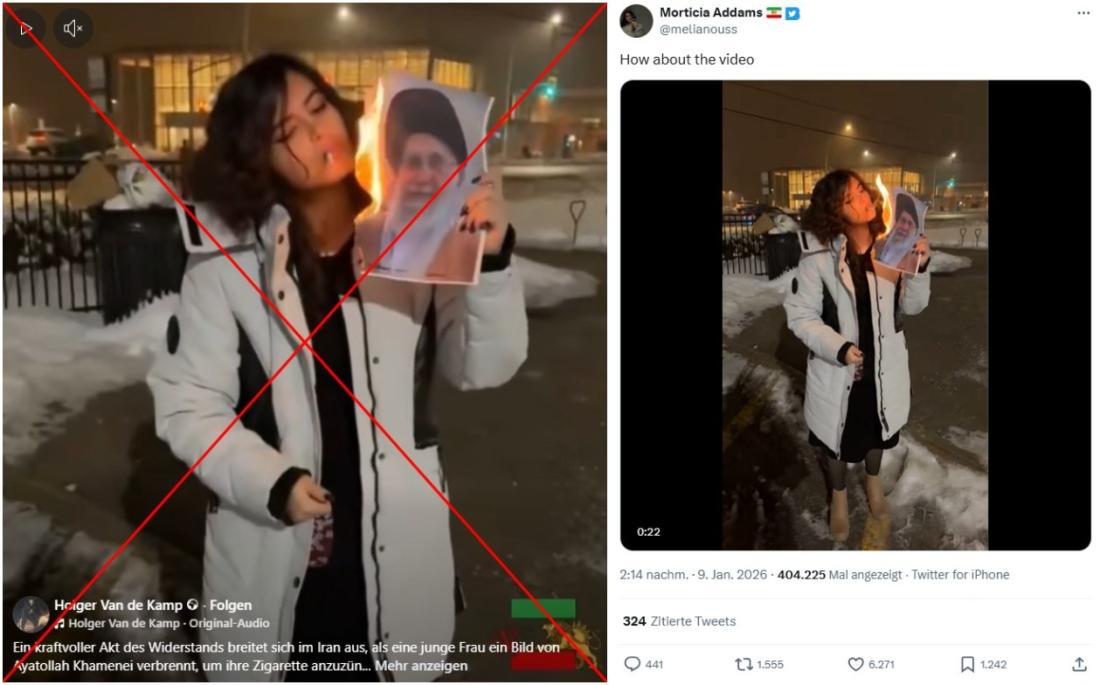 Im Iran protestieren Tausende gegen die Führung der Islamischen Republik, Menschenrechtsorganisationen berichten von unzähligen Festnahmen und befürchten zahlreiche Tote. Die landesweiten Demonstrationen werden von einem viralen Trend begleitet: Iranerinnen zünden sich Zigaretten an einem brennenden Porträt des geistlichen Oberhaupts Ayatollah Ali Chamenei an und posten Aufnahmen davon in sozialen Medien. Online wird fälschlich behauptet, eine dieser Aufnahmen sei im Iran entstanden. Zwar ist die Frau in dem Video laut eigener Auskunft Iranerin, jedoch lebt sie in Kanada und nahm das Video dort auf. Das bestätigt eine Geolokalisierung der Aufnahme.