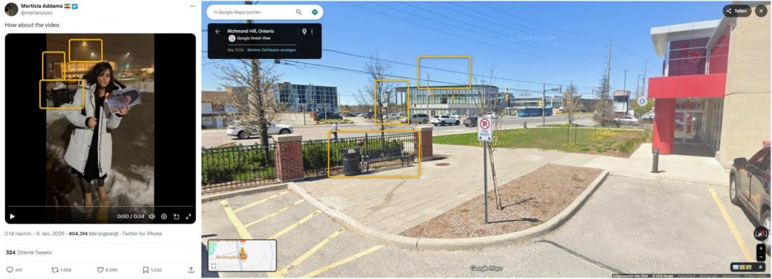In der Beschreibung ihres X-Accounts hat die Frau im Video die kanadische Stadt Toronto als Ort angegeben, in dem sie lebt. Die portugiesische Faktencheck-Organisation Lusa bestätigte mit einer Geolokalisierung des Videos, dass es auf einem Parkplatz in Richmond Hill am Stadtrand von Toronto aufgenommen wurde. Elemente im Hintergrund des Videos stimmen mit Bildern auf Google Streetview überein: