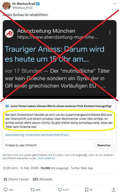 Der X-Beitrag ist mit einer Community Note versehen, die darauf hinweist, dass der Screenshot "ein zusammengeschnittenes Bild aus der Überschrift und einem privaten User-Kommentar unter dem Artikel" sei. "Im Artikel selbst steht davon nichts. Es gibt bisher keine Anhaltspunkte, dass der Täter kein Grieche war."