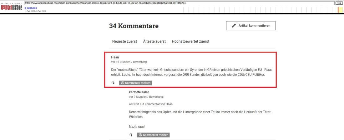 Der vollständige Leserkommentar lautet: "Der 'mutmaßliche' Täter war kein Grieche sondern ein Syrer der in GR einen griechischen Vorläufigen EU - Pass erhielt. Leute, ihr habt doch Internet, vergesst die ÖRR Sender, die belügen euch wie die CDU/CSU Politiker."