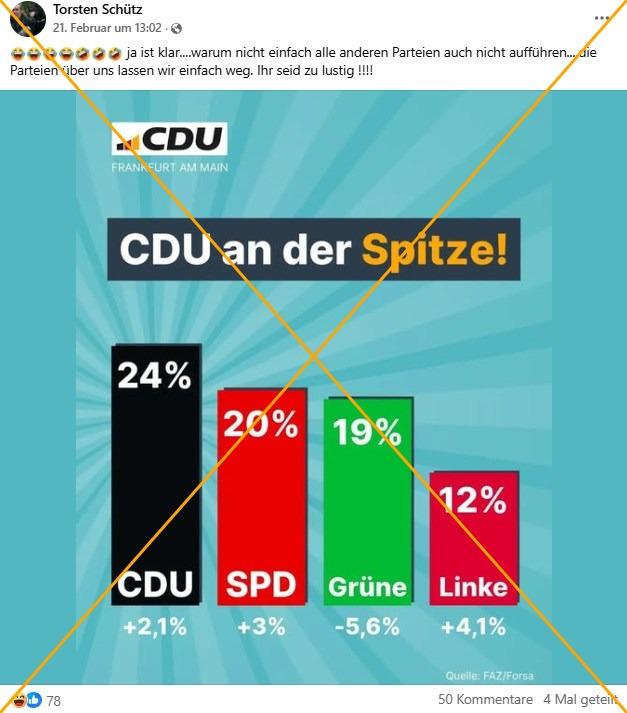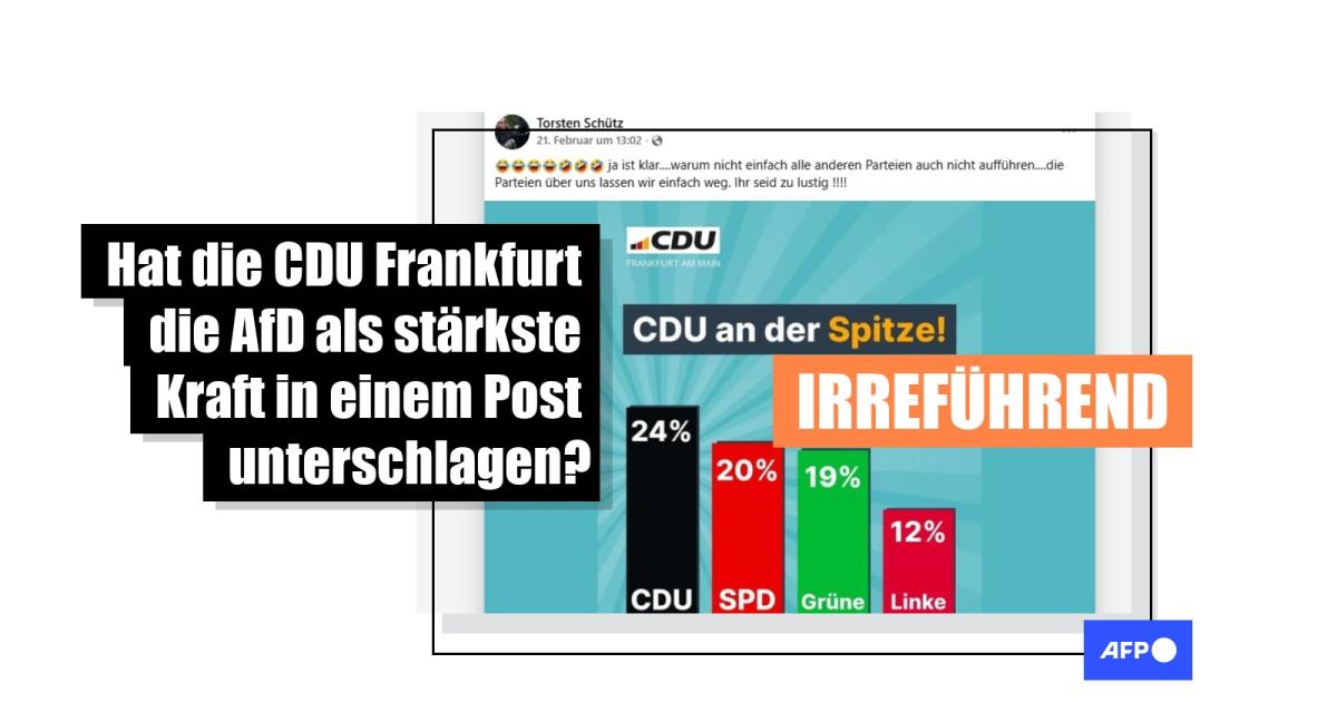 Die Werte aus dem Artikel stimmen mit jenen im Beitrag der CDU überein. Die "FAZ" schreibt: "Laut der Umfrage liegt die CDU in Frankfurt bei 24 Prozent, die SPD bei 20 Prozent, die Grünen kommen auf 19 Prozent. Auf dem vierten Platz folgen die Linken mit zwölf Prozent vor der AfD mit elf Prozent. Volt und FDP kommen jeweils auf drei Prozent, BFF (Bürger für Frankfurt, Anm. v. AFP) und BSW auf zwei Prozent der Wählerstimmen."