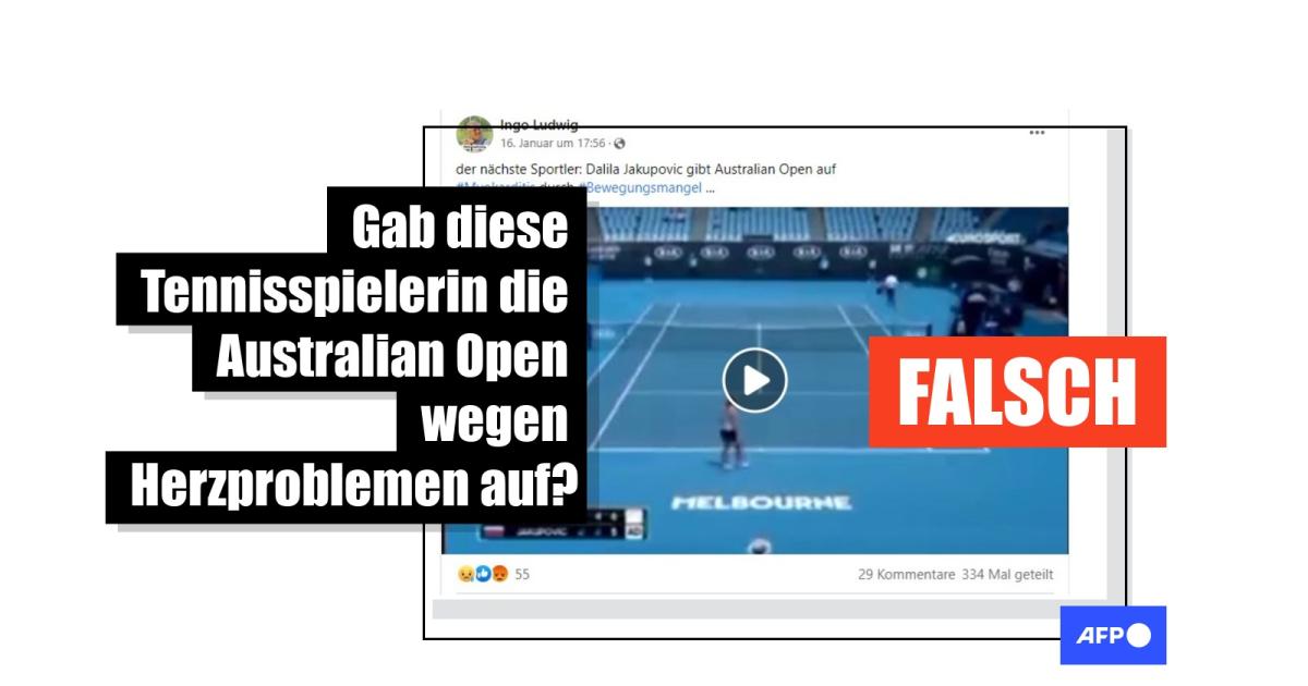 Die Falschbehauptungen: Ein Facebook-Nutzer behauptet im Beitragstext zum Video: "Der nächste Sportler: Dalila Jakupovic gibt Australian Open auf #Myokarditis durch #Bewegungsmangel." Myokarditis ist eine Herzmuskelentzündung, die als mögliche seltene Nebenwirkung bei mRNA-Impfstoffen gilt. Ein weiterer Nutzer stellt einen Zusammenhang zwischen den Problemen der Sportlerin und der Corona-Impfung her: "Wie lange wird es noch dauern, bis das RKI sagt: ‘Eine Myokarditis ist ein guter Indikator dafür, das die Impfung wirkt.’ Medikamente dagegen gibt's ja bald bei Pfizer."