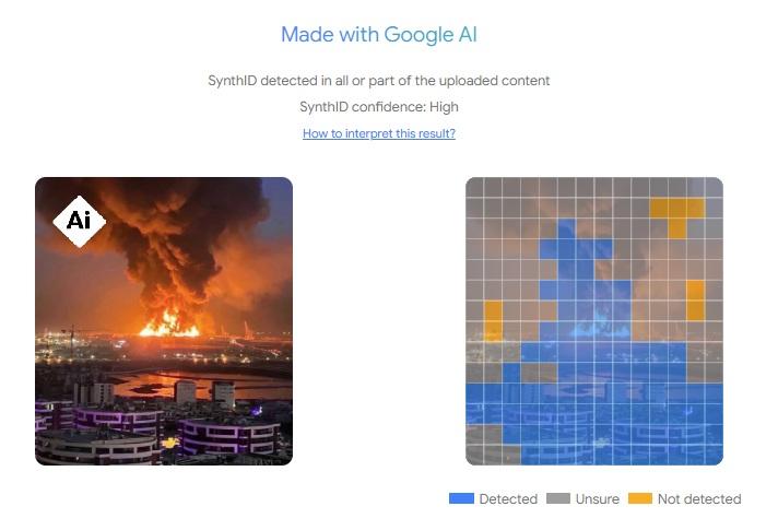 Das bestätigte eine Analyse mit dem Erkennungstool SynthID von Google. SynthID, das 2023 vom Deepmind-KI-Labor von Google eingeführt wurde, identifiziert Bilder und versieht sie mit nicht sichtbaren Wasserzeichen, wenn sie mit der KI von Google generiert wurden.