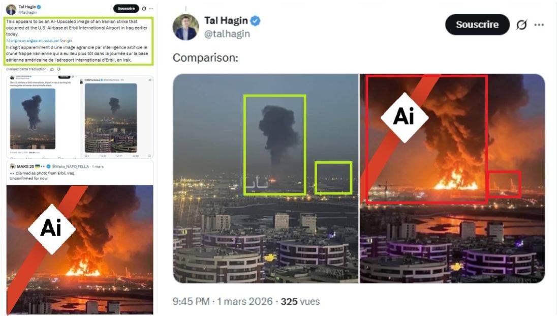 "Das scheint ein KI-hochskaliertes Bild eines iranischen Angriffs zu sein, der heute früh auf den US-Luftwaffenstützpunkt am internationalen Flughafen Erbil im Irak stattfand", schrieb Hagin am 1. März 2026 über das manipulierte Bild.