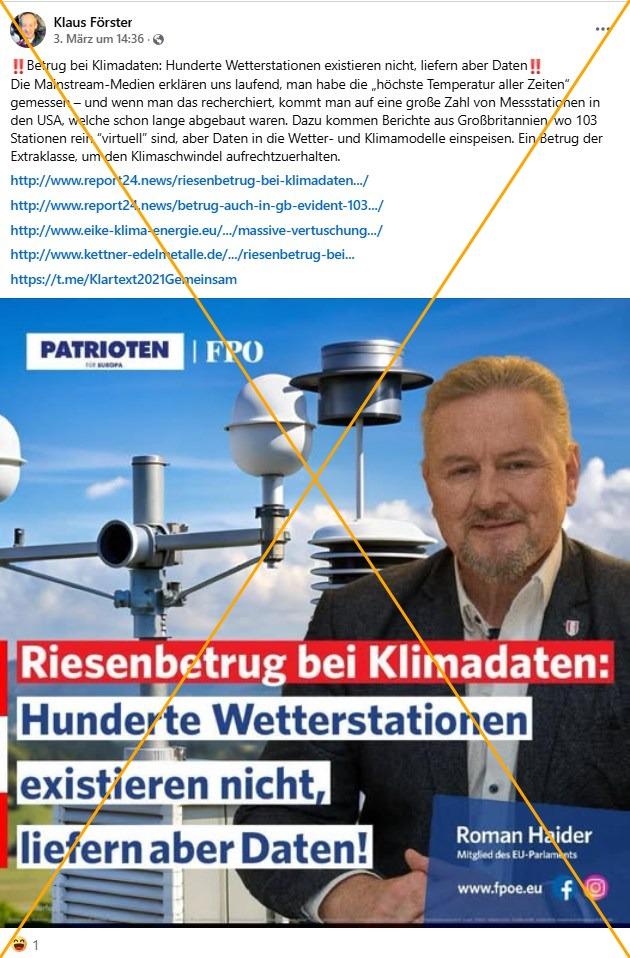 Haider teilte das Sharepic, welches erneut kursiert, ursprünglich am 17. Dezember 2024. Darauf zu lesen ist "Riesenbetrug bei Klimadaten: Hunderte Wetterstationen existieren nicht, liefern aber Daten!". Als angeblicher Beleg wird unter anderem auf Artikel des österreichischen Blogs Report24 verwiesen. Darin wird wiederum ein bekannter US-amerikanischer Klimaskeptiker zitiert. Report24 mit Sitz in Linz hat bereits mehrfach falsche und irreführende Behauptungen verbreitet, die AFP überprüfte. Zu den Quellen zählen auch ein Verein namens EIKE, der AFP immer wieder mit Klimawandelleugnung auffiel, sowie der rechtspopulistische Blog Kettner Edelmetalle.