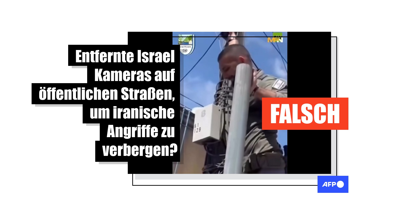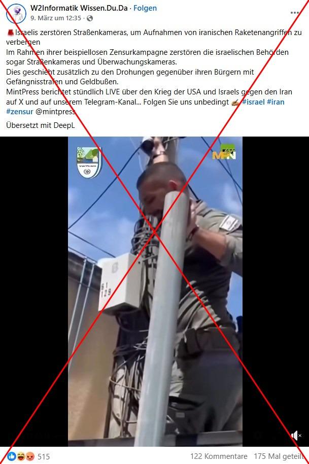 Medien, die über den Krieg im Nahen Osten berichten, sehen sich zunehmend Einschränkungen und Zensur ausgesetzt. Vor diesem Hintergrund kursierte online ein Video, auf dem ein Mann zu sehen ist, der eine Überwachungskamera von einem Mast reißt. Es wird in sozialen Medien fälschlich behauptet, die israelische Regierung habe diese Maßnahme angeordnet, um das Ausmaß der Kriegsschäden in Israel zu vertuschen. Die Aufnahmen stammen aber aus dem Jahr 2025 und zeigen tatsächlich, wie ein israelischer Polizist Kameras abbaute, die von kriminellen Organisationen in öffentlichen Räumen installiert wurden.