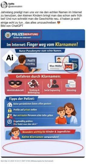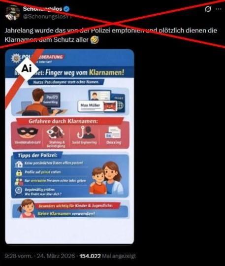 "Finger weg vom Klarnamen!", lautet die Überschrift der Infografik, die ein X-Nutzer teilte und die von der Polizei in Deutschland erstellt worden sein soll. Das Posting wurde seit dem 24. März 2026 hunderttausendfach angesehen. "Jahrelang wurde das von der Polizei empfohlen und plötzlich dienen die Klarnamen dem Schutz aller", schrieb er dazu. In der Infografik sind mehrere Illustrationen, Figuren und Symbole zu sehen. Eine lächelnde Frau mit braunen Haaren legt ihre Hand auf die Schulter eines Kindes, das ein rotes T-Shirt trägt. Auch ein Pass sowie ein Laptop sind unter anderem abgebildet.