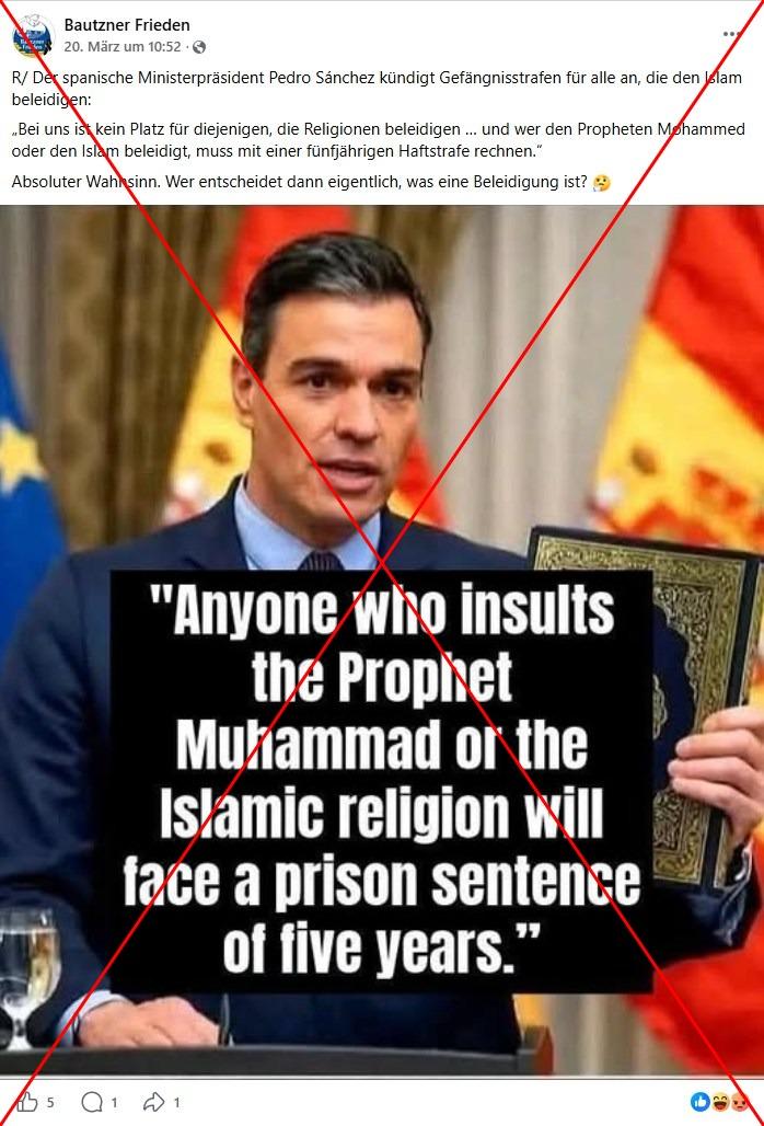 "Bei uns ist kein Platz für diejenigen, die Religionen beleidigen … und wer den Propheten Mohammed oder den Islam beleidigt, muss mit einer fünfjährigen Haftstrafe rechnen", lautet ein Zitat, das in Beiträgen auf Facebook, Instagram, Telegram und X vom 20. März 2026 fälschlich dem spanischen Ministerpräsidenten Pedro Sánchez zugeordnet wird. Darin wird behauptet, in Spanien seien "Gefängnisstrafen für alle, die den Islam beleidigen" angekündigt worden. Die Beiträge enthalten außerdem ein Foto, das angeblich den spanischen Ministerpräsidenten zeigt, wie er ein Exemplar des Korans hält.